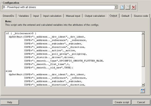 This tab contains the script that is used to set values to attributes of the Configs. The function dpSetWait() sets the values (if required a calculation can be performed on the values before setting - see Output calculation tab). An important consideration is the error handling, which should be performed after a dpSetWait(). In the example above, getLastError() and throwError() are used to notify the user of a possible error when setting the values (display in Log Viewer). For longer scripts (several dpSetWait() functions), execution of the script can be interrupted using return() if an error occurs. If no error handling is included in the script then the user cannot receive any information.
