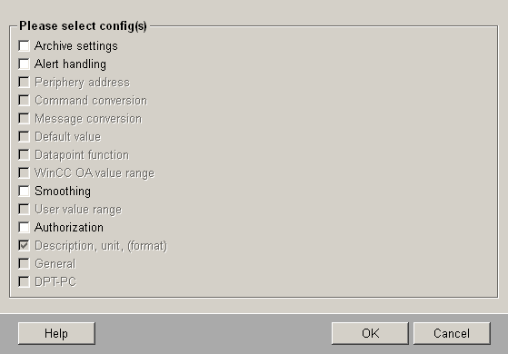 Selecting the check box DPT-PC and clicking on OK attaches the DPT PowerConfig to the master datapoint. The advantage of the DPT PowerConfig is that all the datapoint elements in the structure of the master datapoint can be provided with Configs and configured in one single step. Which parameters are set at which element depends on the programming in the script of the DPT PowerConfig. In the software version there is a predefined DPT PowerConfig for the datapoint type ANALOG2 (see Predefined PowerConfigs).