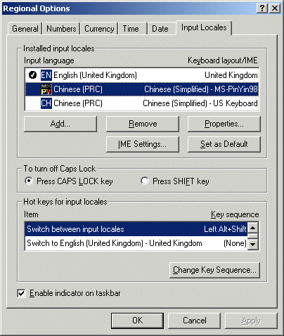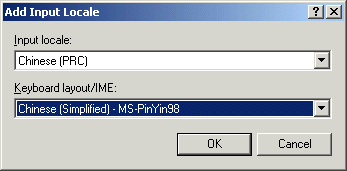 Again: open the Regional Options in the Control Panel (Start,Settings,Control Panel and double click on Regional Options) and change to the Input Locales tab. Click Add... and select in the opening window Input LocaleChinese (PRC) and Keyboard layout/IME Chinese (Simplified) - MS-PinYin98 from the appropriate combo boxes.