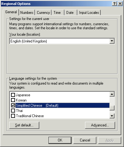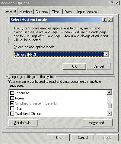 Click Set default... and select the appropriate system locale (for example, Chinese (PRC)). Click OK. The system requires the Windows 2000 installation CD to extract files to local disk. Reboot the system.