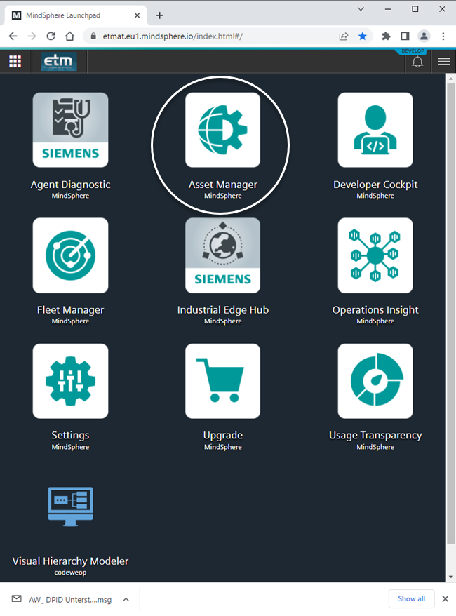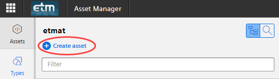 - Select the Asset Manager on the Insights Hub start page https://etmat.eu1.mindsphere.io/index.html#/ . Click on the + Create Asset on the Asset Manager page to add a new asset.