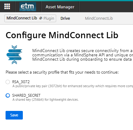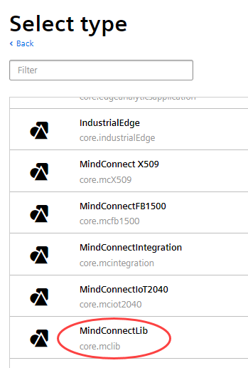 - Select the type MindConnectLib and click on Create. Fill in the form and click on Save.