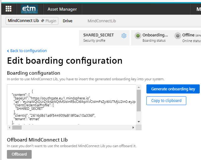 - On the next page, click on Generate onboarding key. The onboarding key is generated and shown in the Boarding configuration field. Then click on Copy to clipboard.