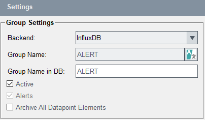 - Alerts: this is an alarm archive. All alert history is saved in the alert archive group "ALERT". Note that currently only one alert group "ALERT" (and a group "ALERT_2" in case of redundancy) is allowed.