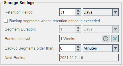 - This is the time how long data (segments) is kept online. Segments exceeding this age (end time of segment < start time of current segment – retention period) will be deleted. This check is done every 30 seconds. Note: Depending on the backend profile setting some of the units (e.g. months and years for InfluxDB®) may not be available. The value can be changed using the arrow button on the right or by typing the value into the field.