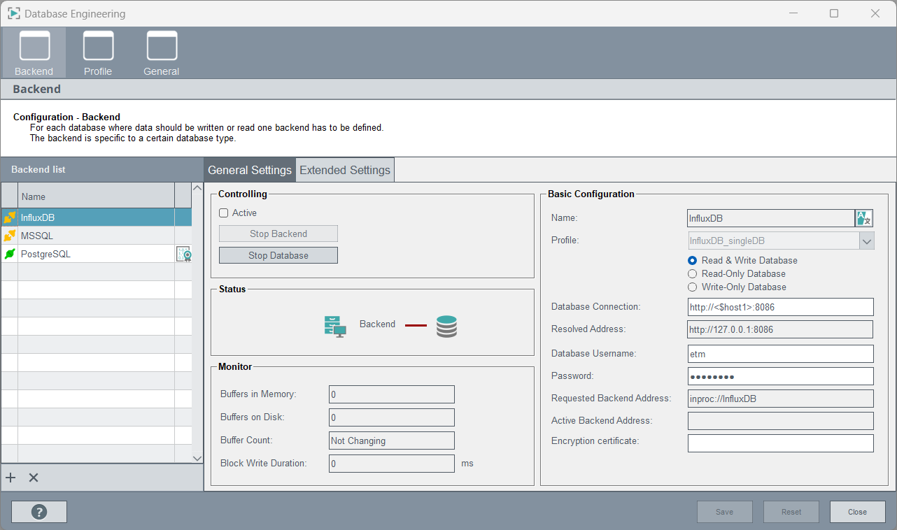 For each database into which data should be written or read from one backend must be defined. A backend is specific to a certain database type (e.g. InfluxDB®, PostgreSQL®, …). Several backends of the same type can be used (for writing / reading data into / from different database instances of the same DB type).