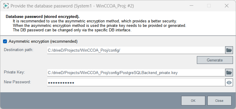 Click on the Password field to change the password. The database password window is opened. You can generate a private key for the asymmetric encryption by using the Generate button. The asymmetric encryption checkbox is ticked only if the private key is configured and a password is specified. For more information about the Generate button, see chapter Storage of the DB Password.