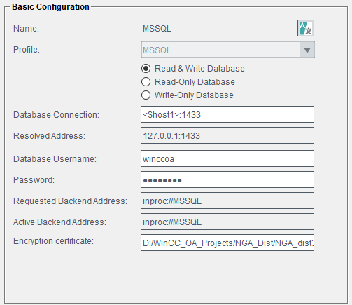 Alternatively you can specify the Database connection also by using the wildcard <$host1> if the database runs on the WinCC OA server.