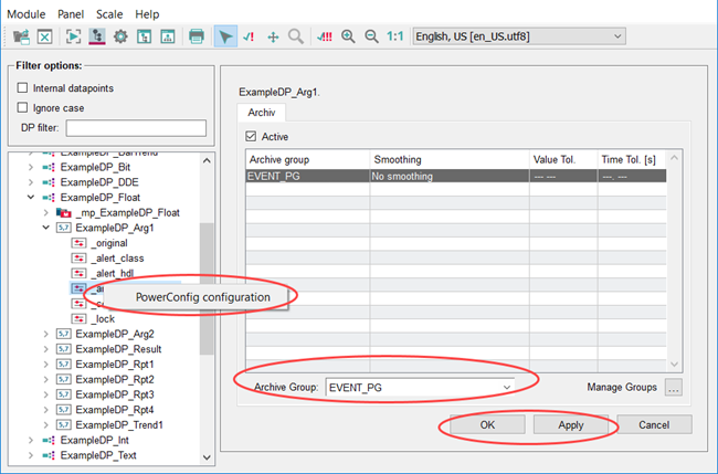 In case of master datapoints, which contain an archive config, you can change a config for individual datapoints by clicking on the archive config and selecting the option PowerConfig configuration. You can change the archive group. Click on Apply and OK to save the changes.