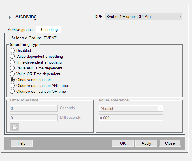 This panel is used for configuration of smoothing for the selected datapoint element to reduce the amount of value changes written into the database. The “Smoothing