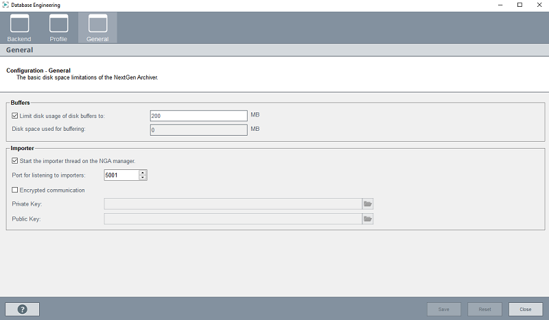 You can use the encrypted communication for the NGA importer by enabling the check box (see the figure above) and choosing the private and public key. To create a private and a public key for the encrypted communication, use the function "createZMQKeys" as follows:#uses "CtrlNgaFrontend" main(mapping event) { dyn_string sImport = makeDynString("private", "public"); createZMQKeys("importerCert",sImport); }Note:If the importer thread is not activated, the performance of the NGA is slightly better. Therefore, the feature should only be activated when required. You can deactivate the thread here.