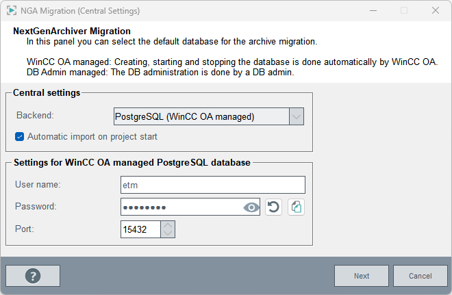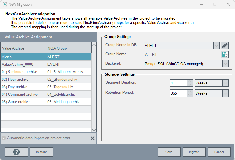 The check box Automatic import on project start starts the NGA Import automatically and the necessary datapoints are automatically created. Note that the automatic data import is only possible if all archive groups are imported to a managed database. This means that you must select a managed backend from the Group Settings.