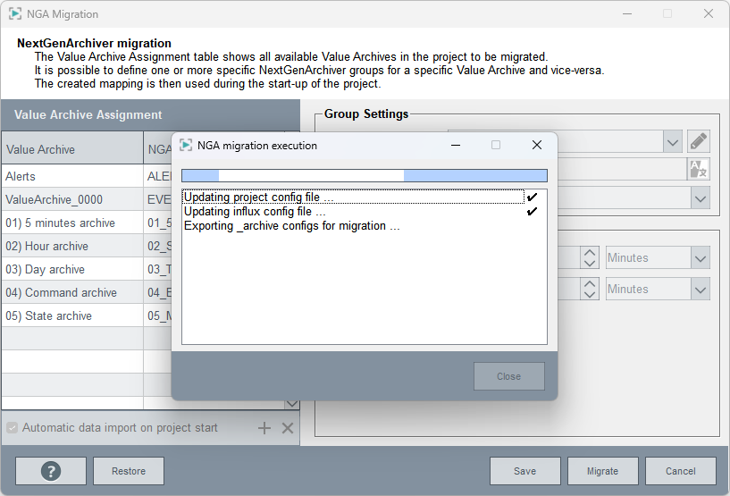 In the panel (see above) the value archives have corresponding default suggestions for the NGA groups. By default, the value archives are mapped "one-to-one" to NGA groups. This means that a 5 minutes archive is converted to a 5 minutes NGA group. By default, also the NGA group names are adapted to correspond to the names of the value archives.