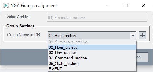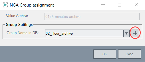 The NGA Group assignment panel is opened. You can select the default groups or create new groups. If you want to create a new group, click on the Plus button on the right - see figure below. You can select how to map the value archives to NGA groups freely. The Default mapping is "one-to-one" (e.g. 5 minutes to 5 minutes).