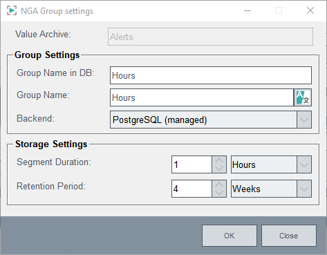 The Group Name in DB specifies the name of the group in the database. The group name again is the name shown in NGA. You can change these names. Select the backend type from the drop-down menu. You can add InfluxDB® (WinCC OA managed), InfluxDB® (DB Admin managed), PostgreSQL® (WinCC OA managed), PostgreSQL® (DB Admin managed) or MS SQL® (DB Admin managed). For the managed databases WinCC OA creates and starts/stops the database. For the unmanaged databases, the database must be available and the connection settings of this backend must be configured later by using the Basic Configuration of the Database Engineering . You can also change the Storage Settings. For the Storage Settings, see chapter Storage Settings.