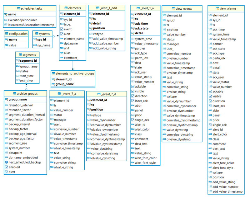 - view_alarms – the view contains the union of all ALARMS segment tables with statuses ONLINE, CURRENT, ONLINE AND BACKUPED and RESTORED.