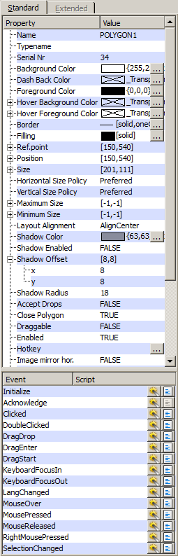 The Standard tab contains all general object properties such as color, size or position of an object. Furthermore, the tab contains the events (CTRL scripts).