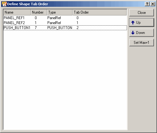 The position of the individual objects in the list can be moved up or down using the arrow symbol buttons. The objects can be addressed and activated in this order in the VISION module (in runtime mode) using the tab key. If there are two shapes with the same tab order number (caused by an error), the "Set Max +1" button can be used to set the number of an object to the highest number +1.
