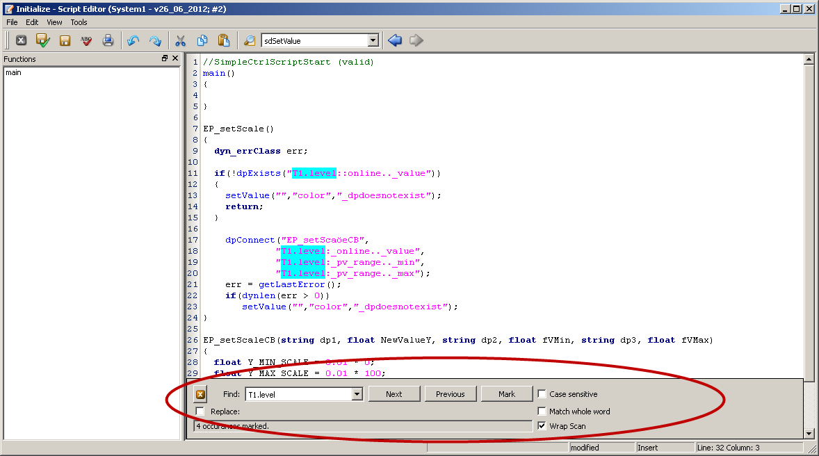 After opening the embedded Find/Replace window the selected text from the script/library is automatically inserted to the combo box "Find".
