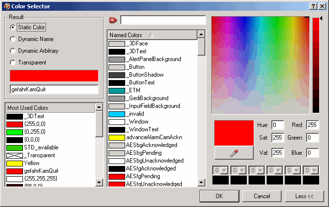 Blinking colors can contain transparent colors. This means that an object does not blink, for example, red-grey but red-background color. To use a transparent color, complete the following steps: Create the transparent color with the color selector (to create the color, use the project view and the color database, see chapter The project view). Choose the "Dynamic arbitrary" option. Select the transparent color and another color, for example, red. Set these two colors using the check boxes below the color selection window. Drag a color from the color list into the check box. Using the check boxes, you specify how long a color will be blinking.