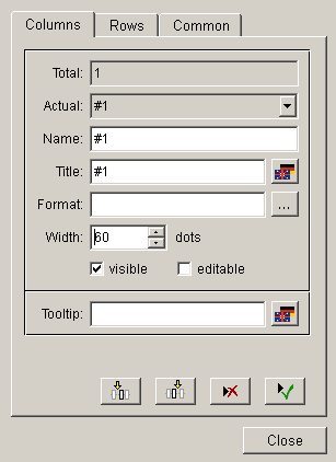 - Format: the selected text format for the specific column. The button with the "..." label opens the format selector. For information about the composition of the format string see Format string .