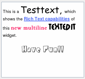 TextEdit is an advanced WYSIWYG viewer and editor supporting rich text formatting with HTML-style tags. It is optimized for handling large documents and responding quickly to user input. TextEdit supports plain text and rich text and can be used as viewer (Read-Only).
