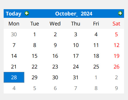 - Today: If you click on the Today button, the current date is selected in the calendar. If the date was changed by clicking the Today button, the selectionChanged() event is triggered. If the calendar page was changed by clicking the Today button, the currentPageChanged() event is triggered.