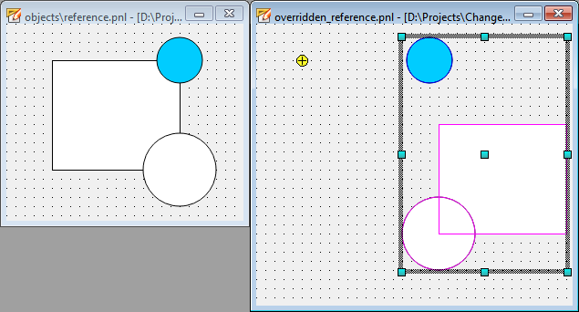 In this example the existing objects were moved down to the right side in the "overridden_reference.pnl" (as shown by the magenta colored frame). The new object (blue circle) added to the reference panel is placed relative to the reference point and is not moved like the other objects.