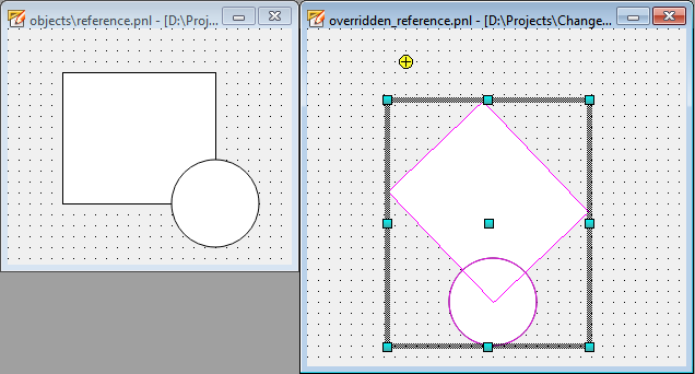The objects in the "overridden_reference.pnl" were moved (overridden) and the whole reference was rotated. In this case the reference point also changed by the rotation. Therefore the objects which were added to the reference panel after the rotation (blue circle and yellow rectangle) are also rotated in the "overridden_reference.pnl" and are aligned relative to the reference point.