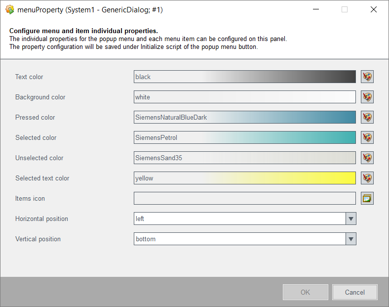 The popup menu configuration is done mainly in the associated configuration panel. It opens automatically at first placement of the "menuButton" and then via double-clicking it in the GEDI.