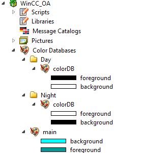 A color scheme is a collection of colorDB files located in a subdirectory of proj_path/colorDB, for example, WinCC_OA_proj_path/colorDB/DayScheme/<colorDB_name>/<color_name_1>…<color_name_n>. Hence, the name of the scheme is "DayScheme" - the name of the directory.