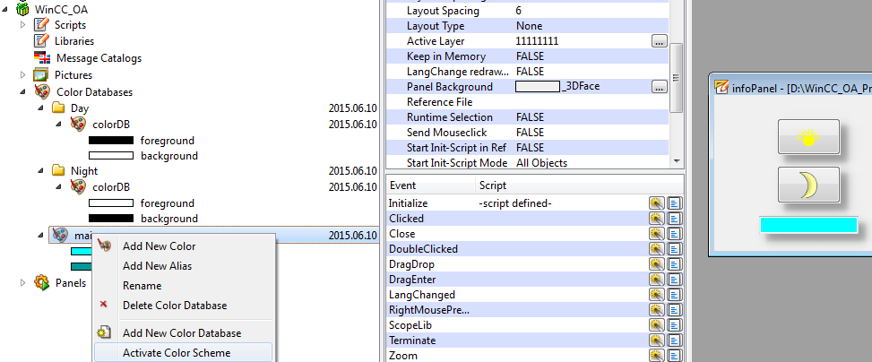 You can set the active color scheme by using the function colorSetActiveScheme() or the config entry activeColorScheme in the UI section of the config file. By setting a color scheme to active, the RGB values of the internal colors of all shapes in opened panels and in the cache are updated with the colors of the new color DB and redrawn. With the aid of the color schemes you can create several color schemes and switch between them. Hence, you can, for example, create different color schemes for day and night.