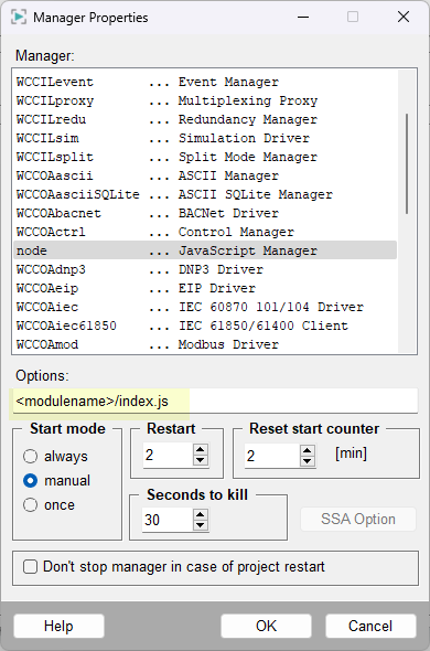 'use strict'; // The command line for the Node.js® manager must contain the path to // this file relative to data/nodejs, e. g.: // // modulename/index.js // require WinCC OA interface const { WinccoaManager } = require('winccoa-manager'); const winccoa = new WinccoaManager(); // main function async function main() { const dpeName = 'ExampleDP_Arg1.'; const value = await winccoa.dpGet(dpeName); console.info('Node.js® manager for WinCC OA working'); console.info('Value of ' + dpeName + ' = ' + value); winccoa.exit(0); } // start the main function main();Note:JavaScript code must be called from inside a method or function to prevent unexpected or undefined behavior. - (optional, but recommended) Check and format your code with:
