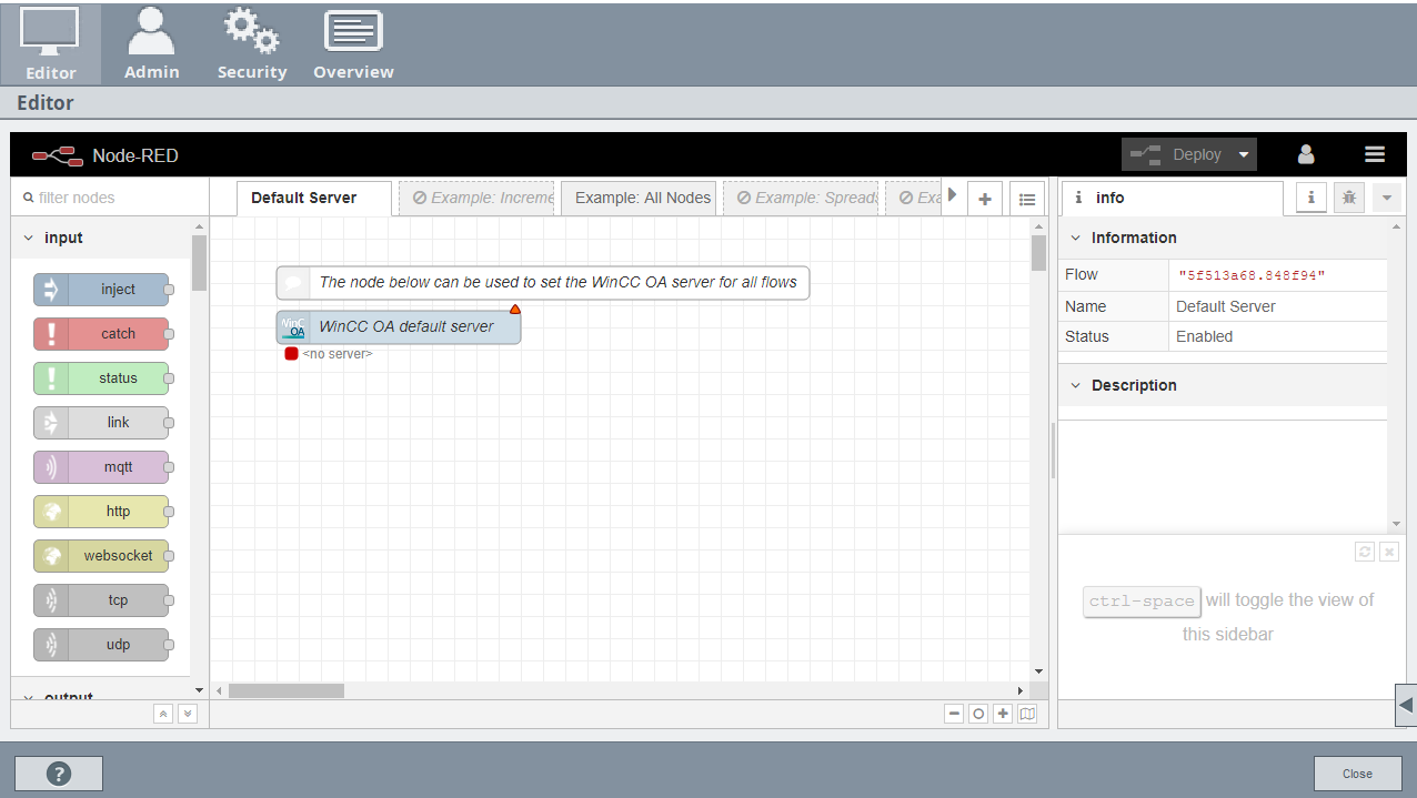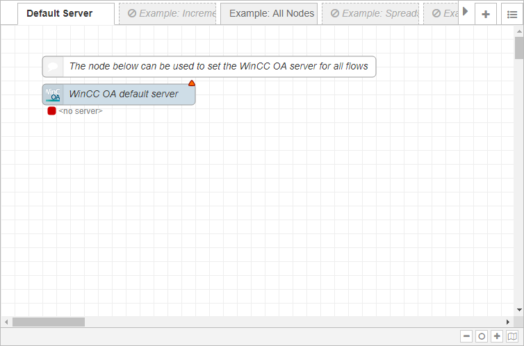 The WinCC OA tool for Node-RED includes the WinCC OA Nodes, which use specific WinCC OA functions. To provide some examples of what WinCC OA specific programs can be implemented, several example flows are included in the installation.