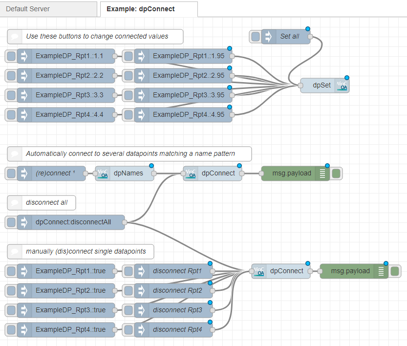 The first part of this example provides different inject nodes, which will each send a message to the dpSet node. They are used to set the given values to the four datapoints the dpConnect nodes will connect to.