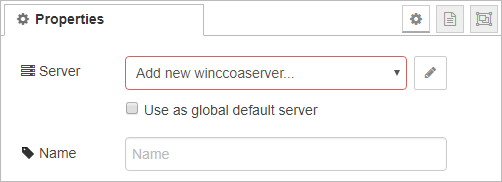 This node configures a WinCC OA server as the Default Server. The server is used for the flow it is placed in. If the "Use as global default server" check box is checked, the server will be used as default for all flows. However, if a flow already has a default server configured, that server will be used instead of the global default.