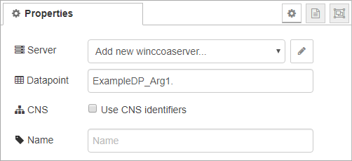 In the nodes containing references to specific datapoints, the datapoints can also be specified by using the CNS identifier. This is done by activating the "Use CNS identifier" check box. If the server is connected to a WinCC OA system, you can use the auto-complete.