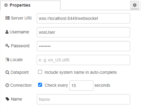 In this menu, first the address of the WebSocket Secure server is specified. The default address is "wss://<hostname>:8449/websocket". If the Port or server name were changed in the config, these changes have to be reflected here.