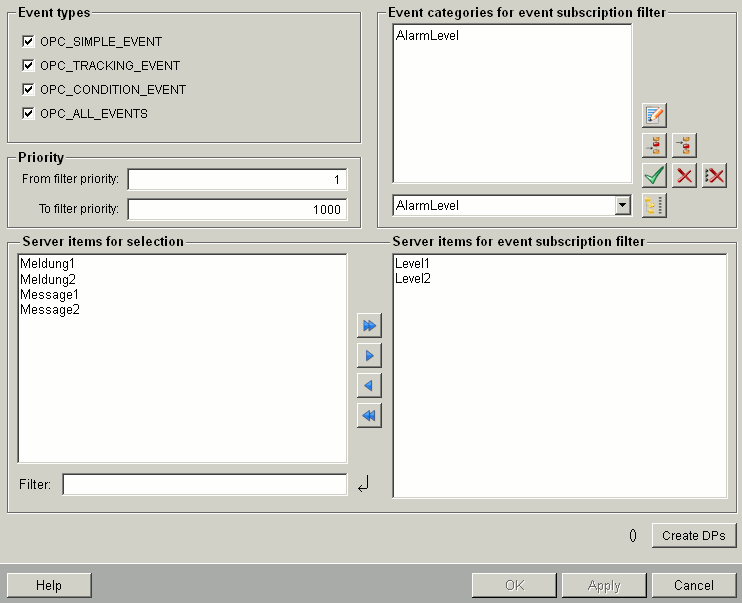 Event Categories for Event Subscription Filter : Editable; only alerts/events of the selected Event categories are passed from the server to the client. If this list is empty, alerts/events for all event categories are sent according to the OPC A&E specification.