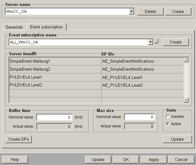 Status : The Event subscription can so be set active or inactive. Alerts/Events are transferred from the server to client only for active event subscriptions. CAUTION: If an item (in the server) is assigned to more than one subscription, alarms/events are transferred automatically if at least one of the assigned subscriptions is active.
