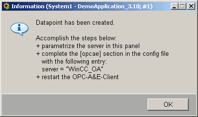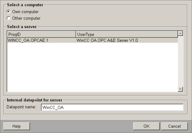 This panel allows to scan the own computer or other computers in the network to find installed OPC A&E server. These are shown in the list beneath. When selecting an installed OPC A&E server a datapoint name is automatically shown (suggested) for the internal datapoint of the server. This name can be changed arbitrarily (for further information on this panel see also Panel OPC Server of the WinCC OA OPC Data Access documentation of this Online Help). The internal datapoint is created and the following information is shown via click on OK: