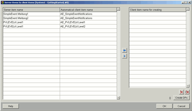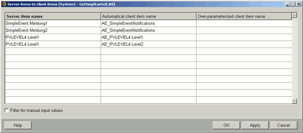 For conditional events you can specify another datapoint (in the column manual client item name) to which a server item is mapped on the client. For simple events you cannot specify different datapoints and only one datapoint is used (simple events are mapped to one datapoint on the client). This datapoint is AE_SimpleEventNotifications by default or you can default or you can define a datapoint by using the config entry [opcae_<servername>] simpleEventDp.