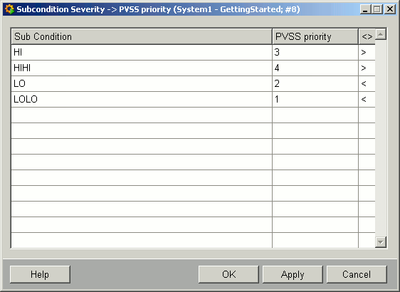 The alert priorities for the single sub conditions can be added in the Priority column. In the column < you define whether the alert range for the sub condition is above or below the valid range. ? is the default value and means "the alert range is above the valid range". A click on the column switches between > (means "alert handling is above the valid range") and < (means "alert handling is below the valid range").
