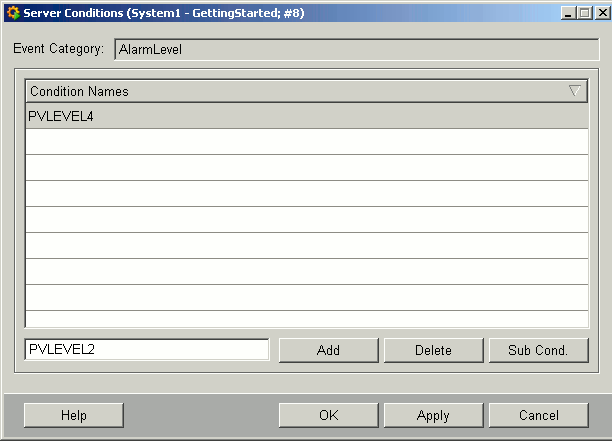 The handling in this panel is the same as described for the panel Event Categories (definition of names for the Conditions - click on Add - Apply saves the configurations). After performing and saving the settings for the Conditions, you can configure Sub Conditions for each Condition by clicking on the same named button. Following panel will be opened: