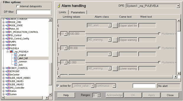 Figure 1. Alert handling for the master datapoint _mp_PVLEVEL4