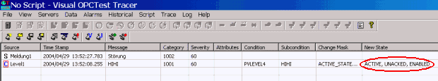 If an alert is triggered for the datapoint Level1 in WinCC OA, it is shown in the Visual OPC Test Tracer with the status "ACTIVE, UNACKED, ENABLED". Also a triggered alert of the Alert1 is shown but cannot be acknowledged since this is a simple event.