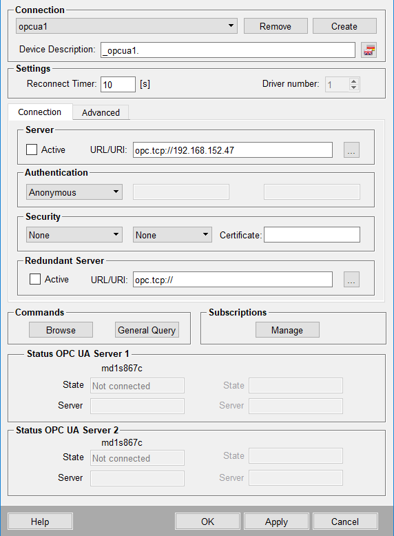 Tick this check box to activate the connection to the OPC UA server. This setting is not effective until the Apply or OK button is clicked. A created and configured connection can be deactivated at any time. Thereby the connection datapoint is not deleted and the connection can be reactivated anytime. The status display changes from "Connected" to "Not connected" if a connection has been deactivated. If a connection has been deactivated, the driver does not communicate with the corresponding OPC UA server anymore. Therefore, it is possible to avoid alarms during maintenance work on the OPC UA server.