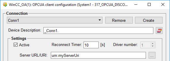 It is possible to define either a URL or a URI in the configuration panel for OPC UA servers. Using URIs allows to configure and use OPC UA servers independently from host name and IP address. In this case the given URI is used to determine the corresponding URL by a Local Discovery Server (LDS). Therefore, no further changes to the WinCC OA configuration are necessary if you want to run the OPC UA server on another host. You only have to register the OPC UA server at the respective LDS.