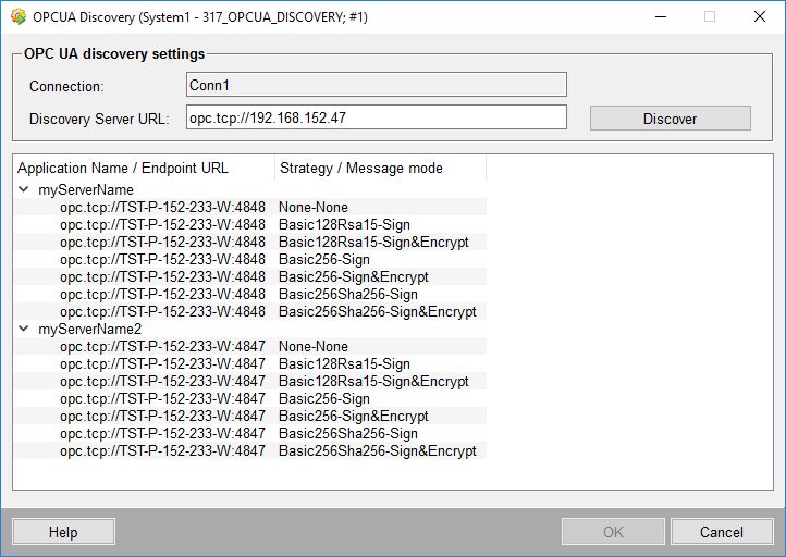 All available servers including their supported endpoints are listed. If you select an endpoint and confirm with the OK button, the server URL as well as strategy and message mode settings are automatically applied.