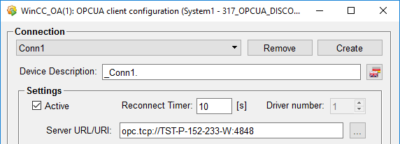 Enter the URL to the server (TCP/IP address and port number). The server URL can be entered directly or selected via the OPC UA Discovery panel. Click the "..." button to open the panel.